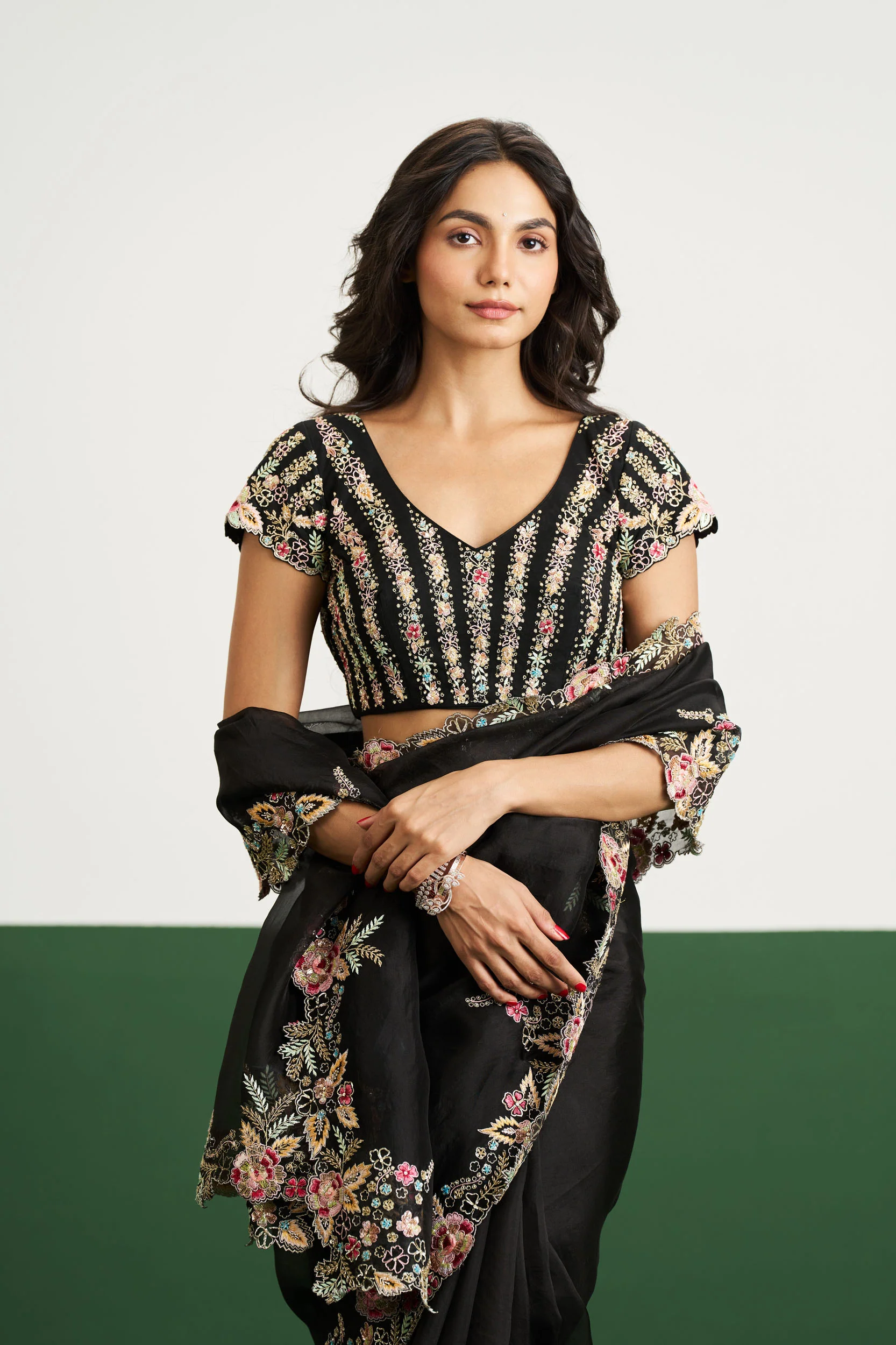 Description: The Kayla Saree Set brings classic black into focus with its elegant drape and chic silhouette — perfect for evening occasions with an edge.