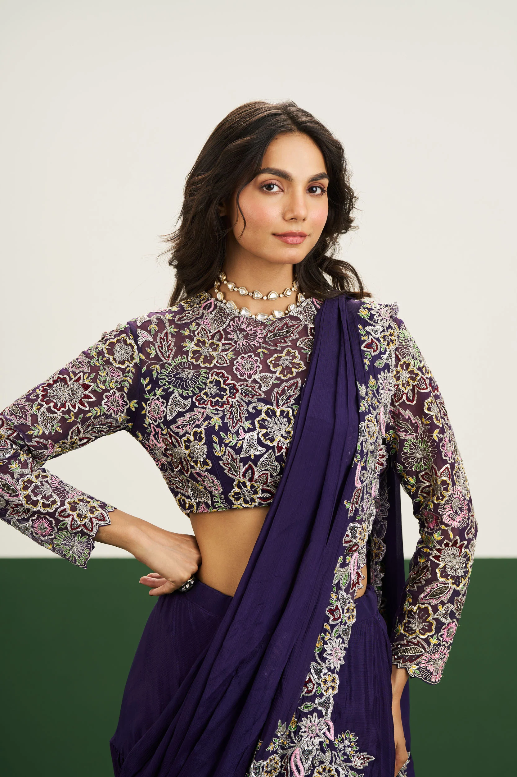 Description: The Taylor Set reimagines the saree with a pre-stitched drape in a rich purple tone. Contemporary, easy, and high on impact — it’s festive dressing made simple.
