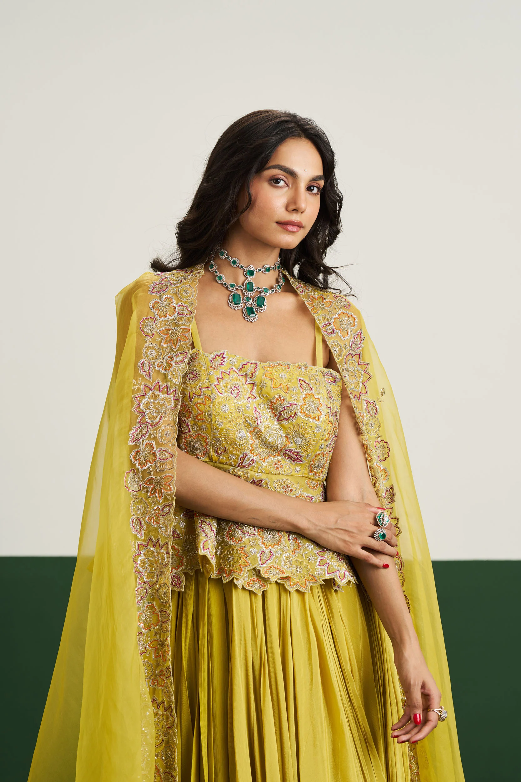 Description: Fresh and festive, the Zoya Set in yellow is playful and bold, combining a flattering peplum top with a dramatic cape for easy elegance.